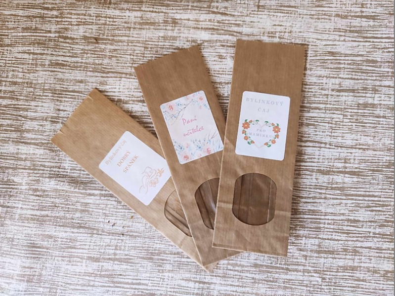 - pytlíček s průhledným okýnkem, 40x70x205 mm, podle druhu bylinek na 20 - 50 g čaje